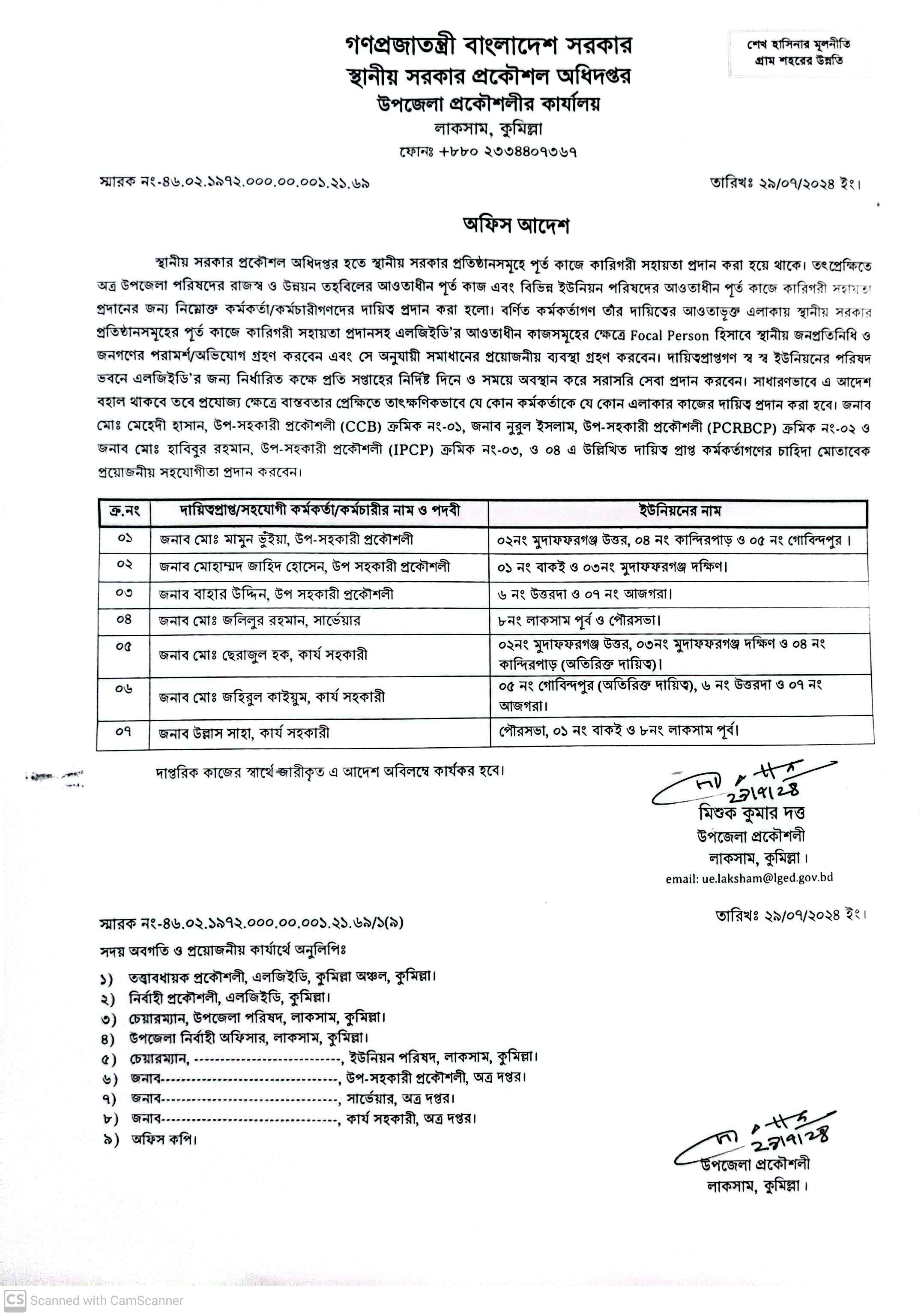 ইউনিয়ন পরিষদে কারিগরী সহায়তা প্রদান এবং ইউনিয়নাধীণ কাজে সার্বিক দায়িত্ব পালনের জন্য উপজেলা প্রকৌশলী’র দপ্তরে কর্মরত কর্মকর্তা/কর্মচারীদের দায়িত্বপ্রাপ্ত প্রদান সংক্রান্ত অফিস আদেশ